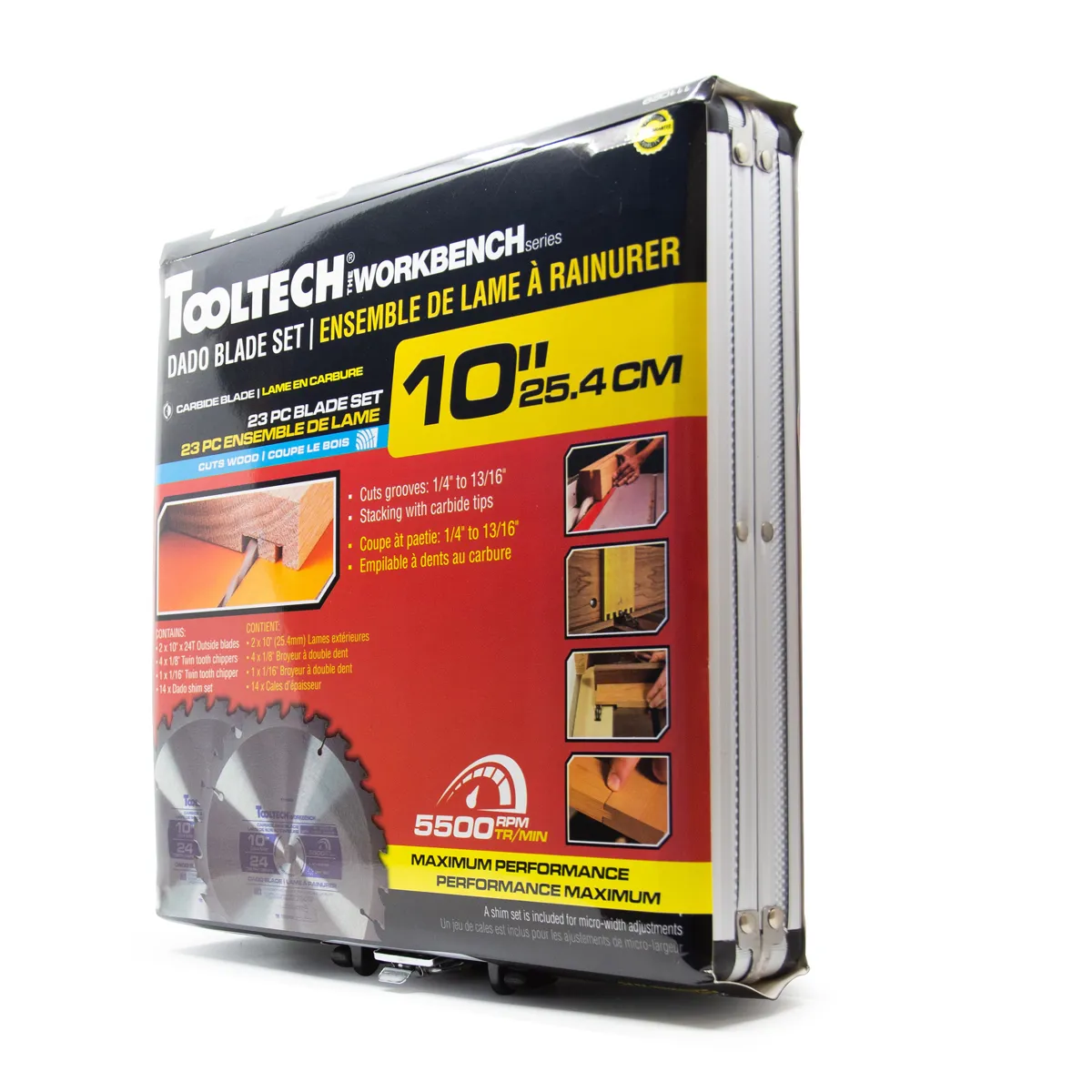 The Tooltech® Workbench Series® 10in Stacked Dado Blade Set delivers precision, power, and versatility for every cut. Engineered for professional woodworkers and serious DIYers, this 23-piece set makes it easy to create smooth, accurate grooves in wood, plywood, and composite materials. With two outer cutting blades featuring beveled teeth for crisp, clean edges and five chipper blades for adjustable groove widths from 1/4in to 13/16in, you get perfect results for cabinetry, shelving, joinery, and more. The anti-kickback tooth profile adds an extra layer of safety, ensuring controlled, precise cuts on your table saw, miter saw, or chop saw.