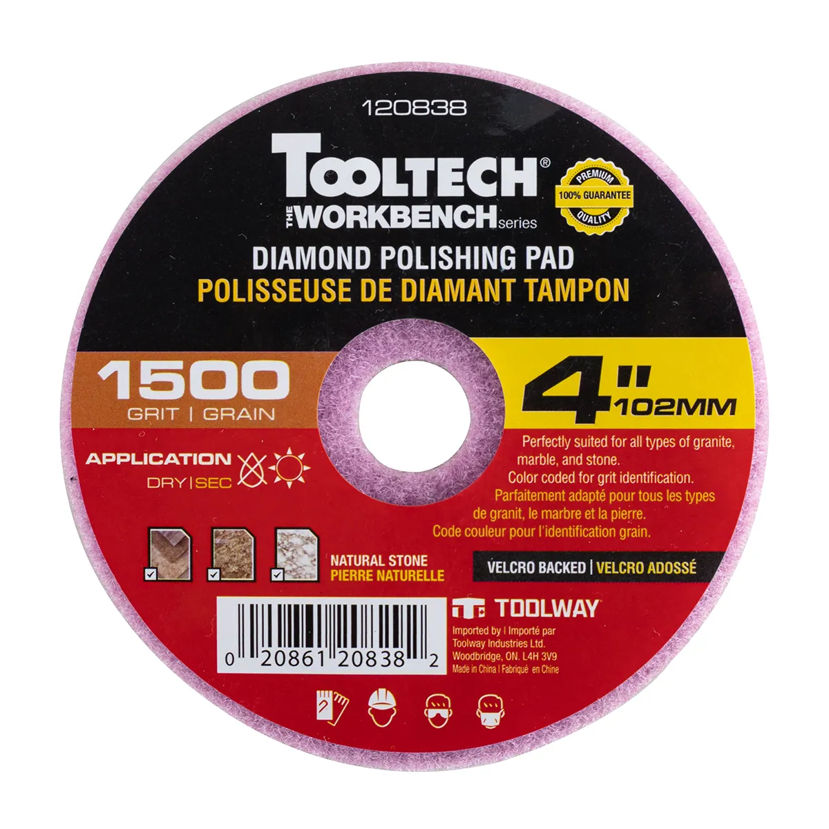Tooltech’s® line of Workbench Series 4in polishing pads are designed for the grinding and polishing of marble, granite, ceramics, and other stone materials. Designed to fit most hand grinders, they are available in multiple grits, ensuring the proper one is chosen for the task at hand.  Pads are colour coded for quick grit identification and are hook and loop backed for rapid and effortless changing. These diamond pads are rated for high sharpness and are used dry.