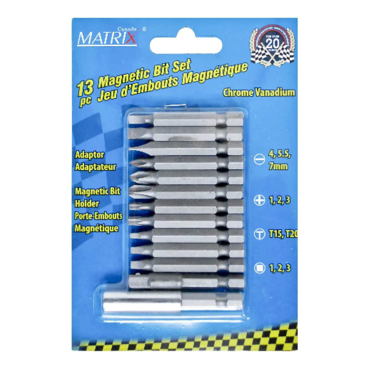 • Contains: (1)Adaptor, (1) Magnetic bit holder, (3) Square: #1, #2, #3, (3) Phillips: #1, #2, #3, (3) Slot: 4mm, 5.5mm, 7mm, (2) Torx: T15, T20.