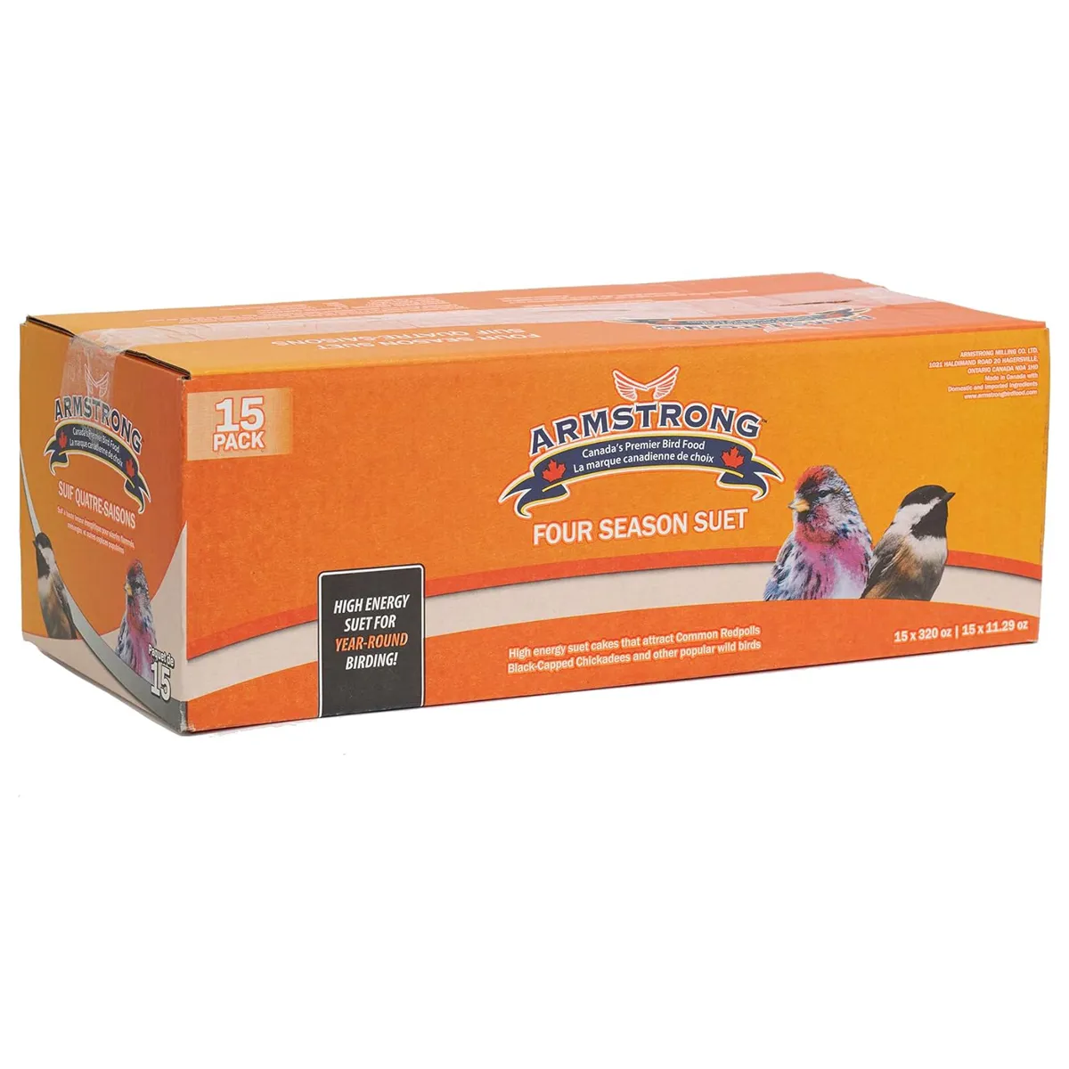 Armstrong Four Seasons Suet delivers dependable, high-energy nutrition to support wild birds all year long. Made with rendered beef fat, grains, and seeds, it provides the calories birds need to stay active, especially during colder months. Easy to unwrap and place in a standard suet cage, it’s a simple and reliable feeding solution for any season.
