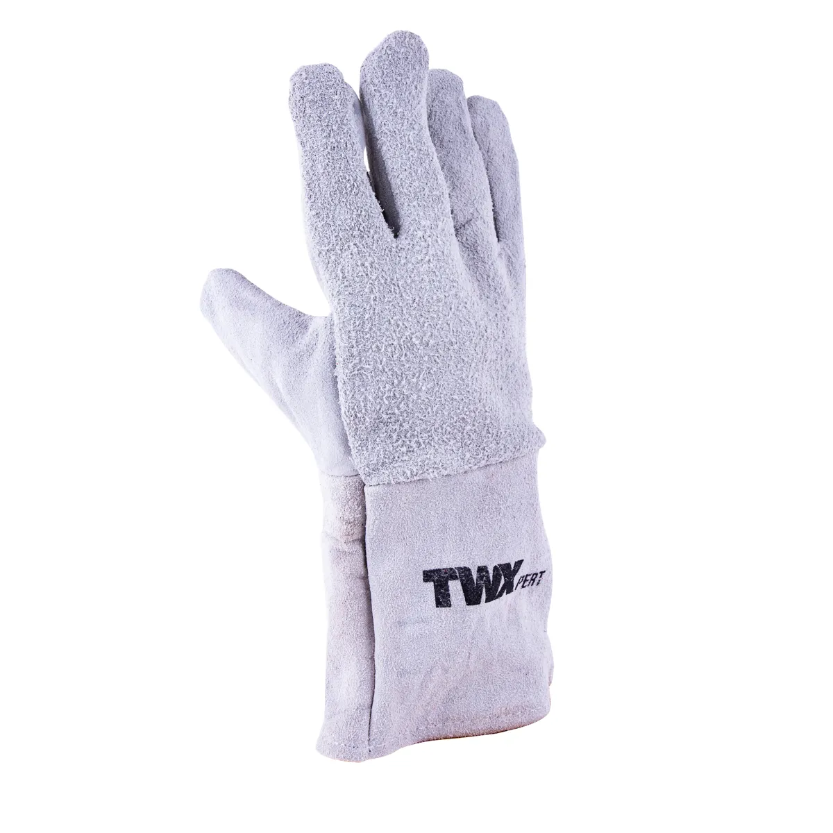 The grey thick thermal cowhide gloves with long cuff are ideal for welding work in heavy industry.