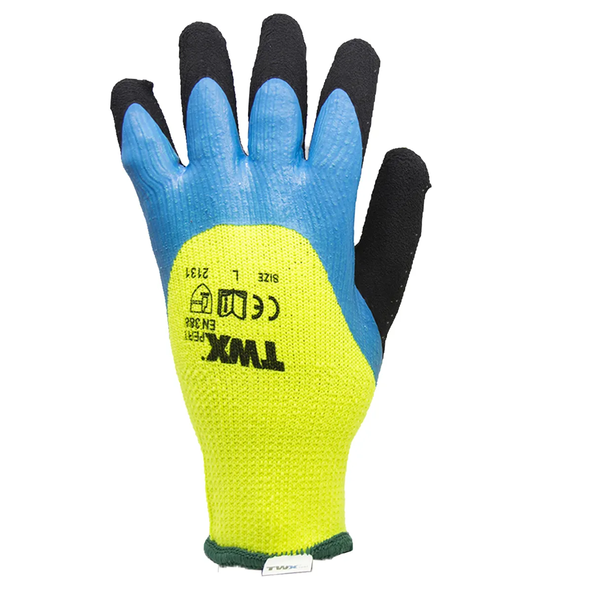 1dz. Knitted Poly Terry Lined Gloves Neon Green W / Latex Palm Blue / Sandy Black (L)