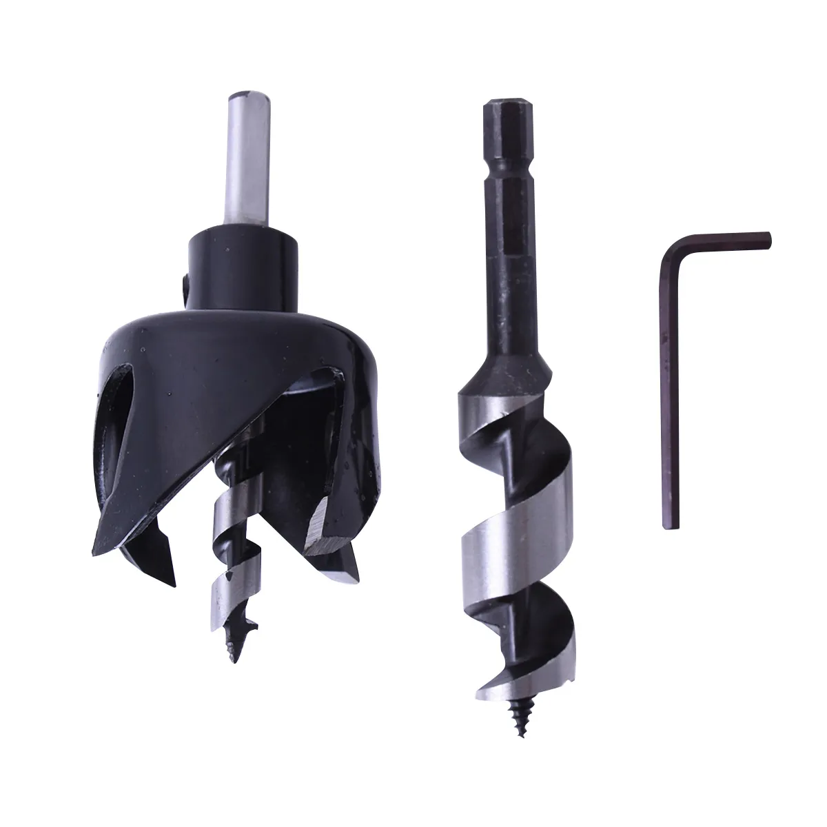 Precise boring for door is assured with four edged hole saw with auger bit for pilot hole.