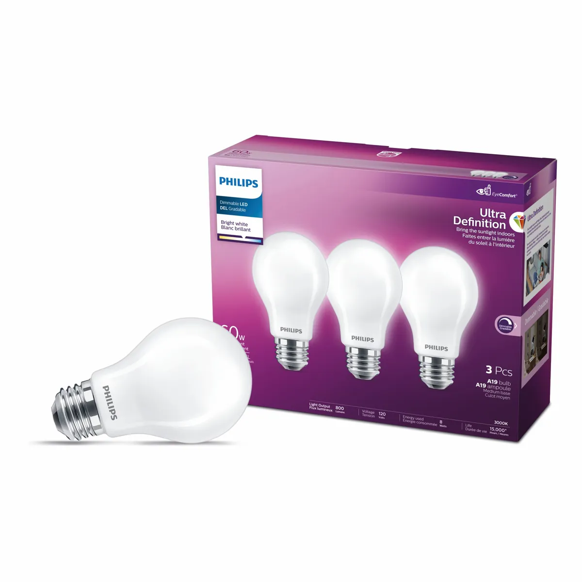 Philips LED light bulbs provide a beautiful; warm white light; an exceptionally long life; and immediate; significant energy savings. With a pure and elegant design; this bulb is the perfect replacement for your frosted traditional bulbs.