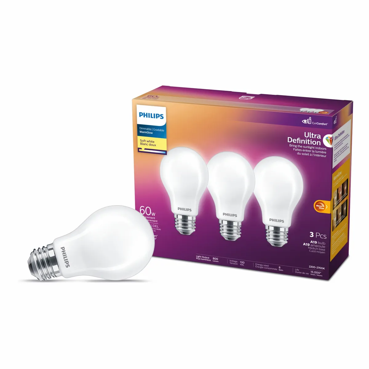 3PK Ultra Definition Frosted LED Bulbs A19 60W E26 Soft White Warm Glow Dimmable