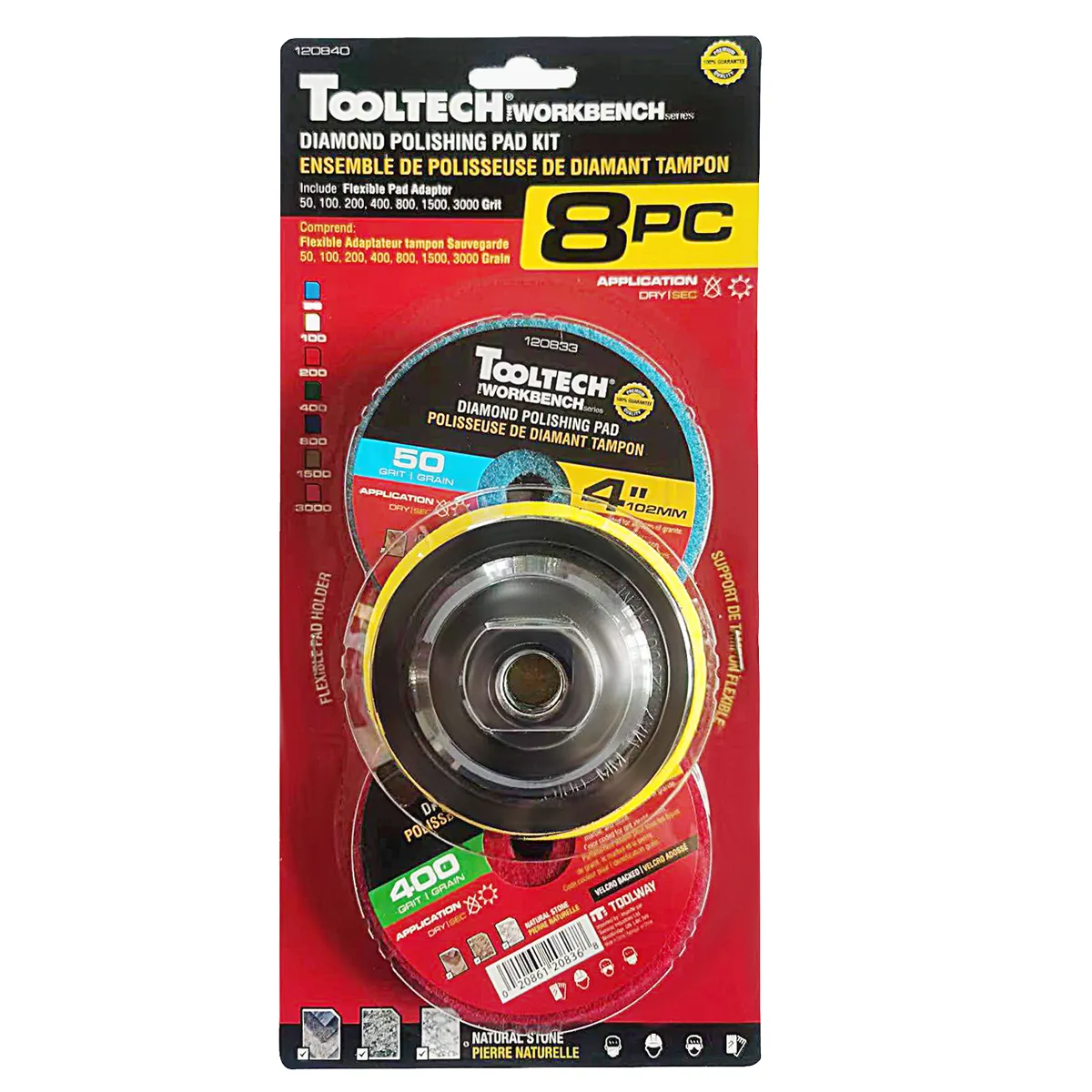 Tooltech’s® line of Workbench Series 4in polishing pads are designed for the grinding and polishing of marble, granite, ceramics, and other stone materials. Designed to fit most hand grinders, this set includes 7 dry pads and one adaptor. Pads are color coded for quick grit identification and are hook and loop backed for rapid and effortless changing. These diamond pads are rated for high sharpness and are used dry.