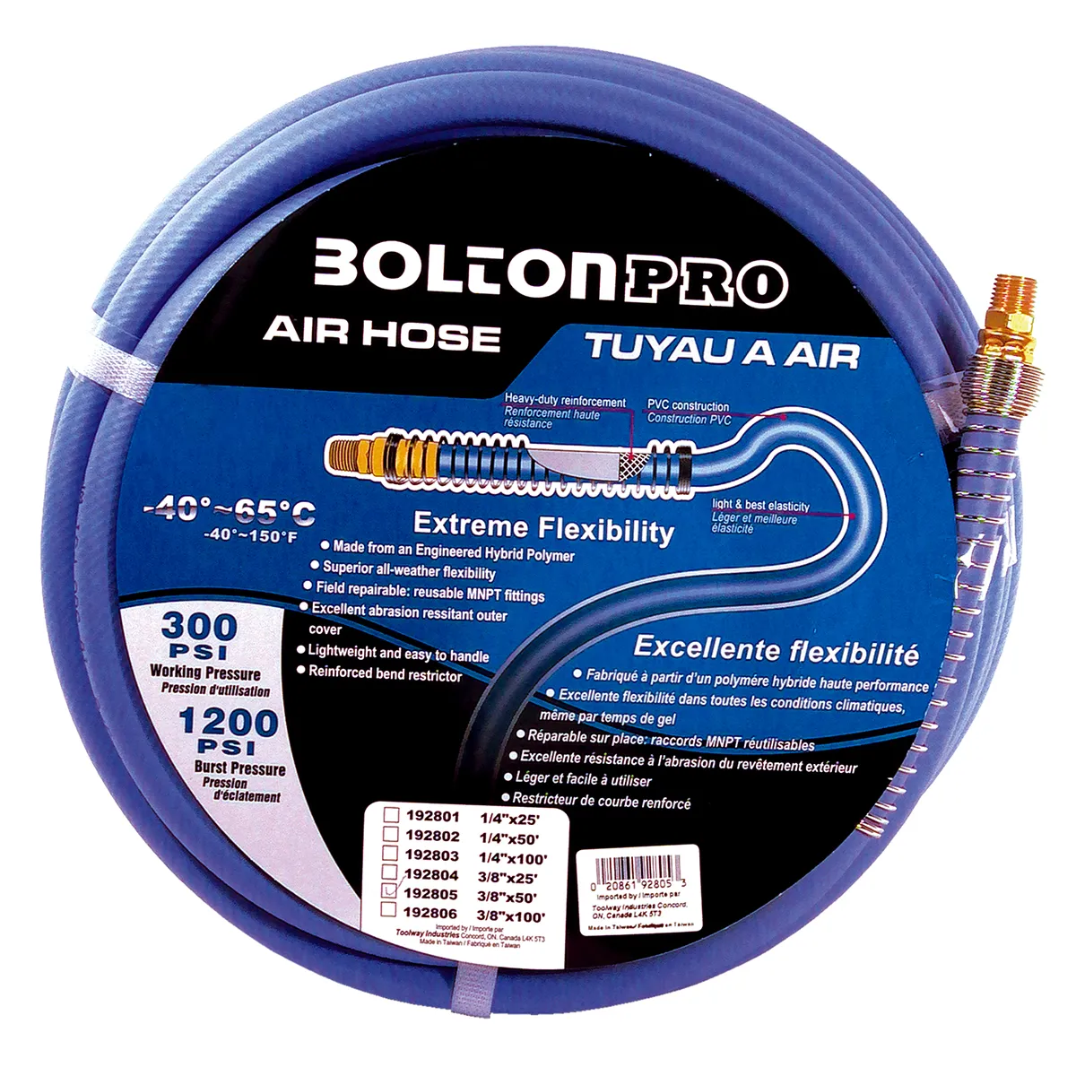 Tooltech Air hoses by Toolway are constructed from engineered hybrid polymer making them extremely durable and able to remain flexible from-45-Degree C to Plus 65-Degree C.; making them your first choice for all your pneumatic air tools needs.