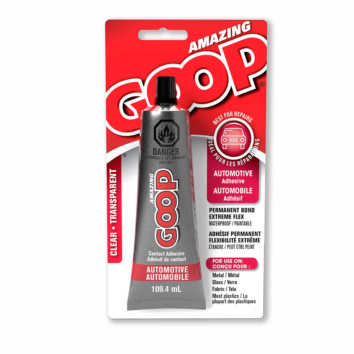 Amazing GOOP Automotive will repair, seal and stick to a wide variety of materials. Its versatility makes it ideal for all kinds of automotive needs: everything from repairing upholstery to coating battery terminals to attaching loose trim! Bonds easily to a wide variety of materials, including metal, glass, vinyl and leather.
