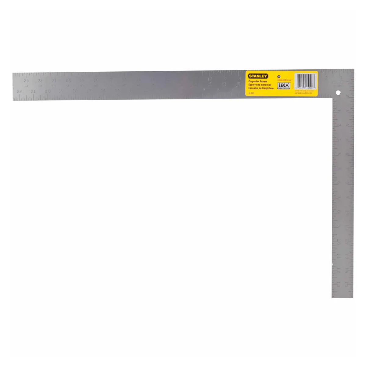 STANLEY 45-500 Steel Carpenters Squares; English. High-quality hardened steel for durability and long life. Black 1/8in embossed graduations for easy reading on face and back. Reverse reading scale makes measuring more efficient. Treated with a clear; protective buff finish that resists rust.
