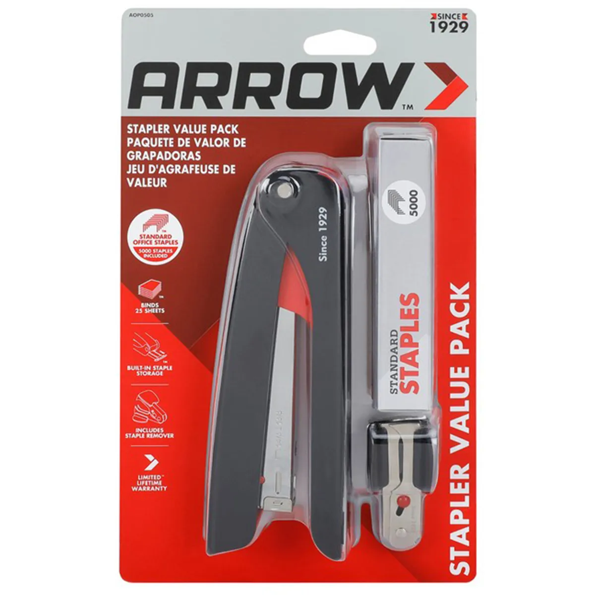 The Arrow AOP0505 Stapler Value Pack by Arrow Tool Group has everything you need for efficient stapling; including the Arrow Desktop Stapler; Staple Remover; and a box of 5000 Arrow 202 Staples.
