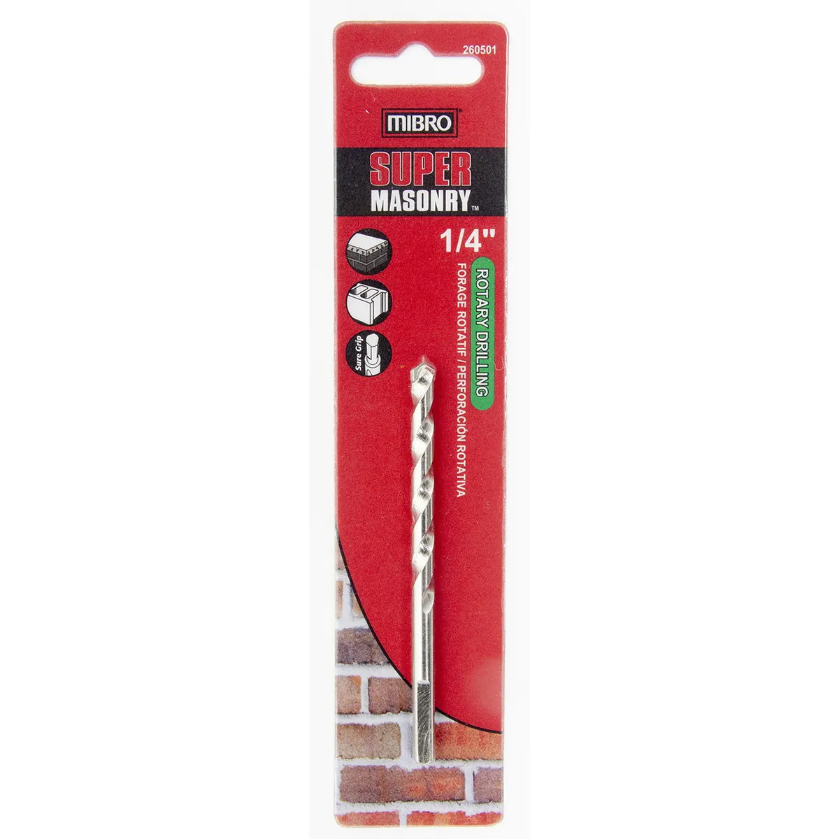 Rotary drilling. Positive angle tip geometry. Premium brazing material adheres carbide tip to the drill bit body for maximum durability. Slow spiral flute design ensures efficient material removal allowing the bit to run cooler and extending service life. Long sizes are 13in (330.2mm) versus 12in (304.8mm); allowing bit to fully clear a cinder block. Not recommended for drilling into glass and ceramics.