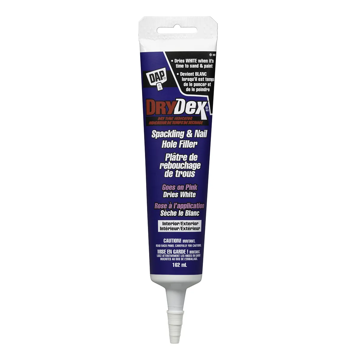 DAP DryDex spackling; america's #1 seller; contains a patented dry time indicator causing the product to change color when optimum dry time is achieved. It goes on pink and turns white when dry. This unique feature is the indicator that it is ready to sand and paint.