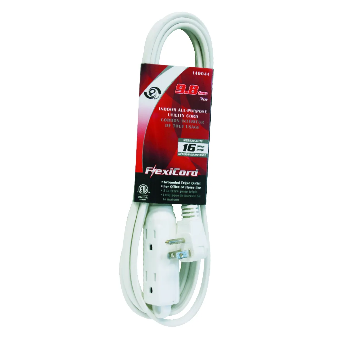 The FlexiCord 10ft Indoor All-Purpose Extension Cord is a versatile, grounded solution for everyday indoor power needs. Its SPT-3 16 AWG construction and triple NEMA 5-15R outlet configuration handle a wide range of appliances, electronics, and tools. The flexible PVC jacket maintains performance from -20°C (-4°F) to +60°C (+140°F), and the compact 10ft length keeps cords neat and unobtrusive. Rated 13A/125V/1625W.