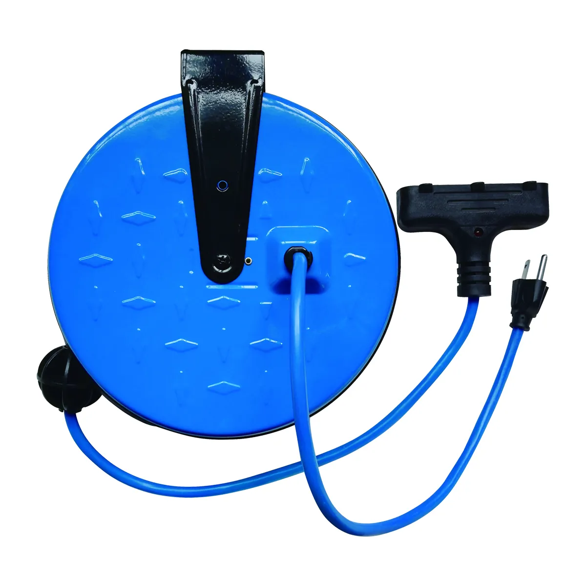 The FlexiCord Retractable Metal Reel Extension Cord keeps your workspace organized and your power within reach. The durable metal reel and cord guide make extension and retraction smooth and tangle-free, while the included mounting bracket lets you secure it to a wall or ceiling for permanent installation. A triple outlet with power indicator and cETLus listing ensure safe, reliable performance on any job. SJTW 16/3 construction handles medium-duty indoor and outdoor applications.