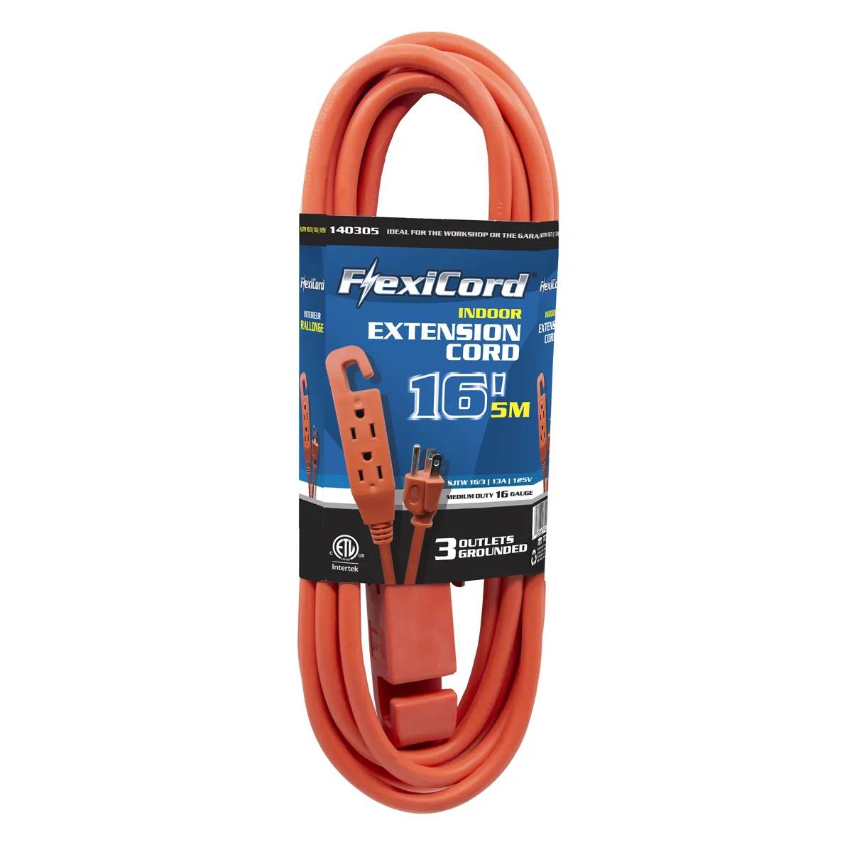 The FlexiCord Outdoor Extension Cord with Triple Outlets and Hanging Hook is built for homeowners and tradespeople who need organized, accessible power in any outdoor setting. A pure copper conductor ensures maximum current flow and reliable performance, while the durable PVC jacket withstands outdoor conditions from -40°C (-40°F) to +60°C (+140°F). Three outlets and an integrated hanging hook make it as practical as it is durable. Rated 13A/125V/1625W.