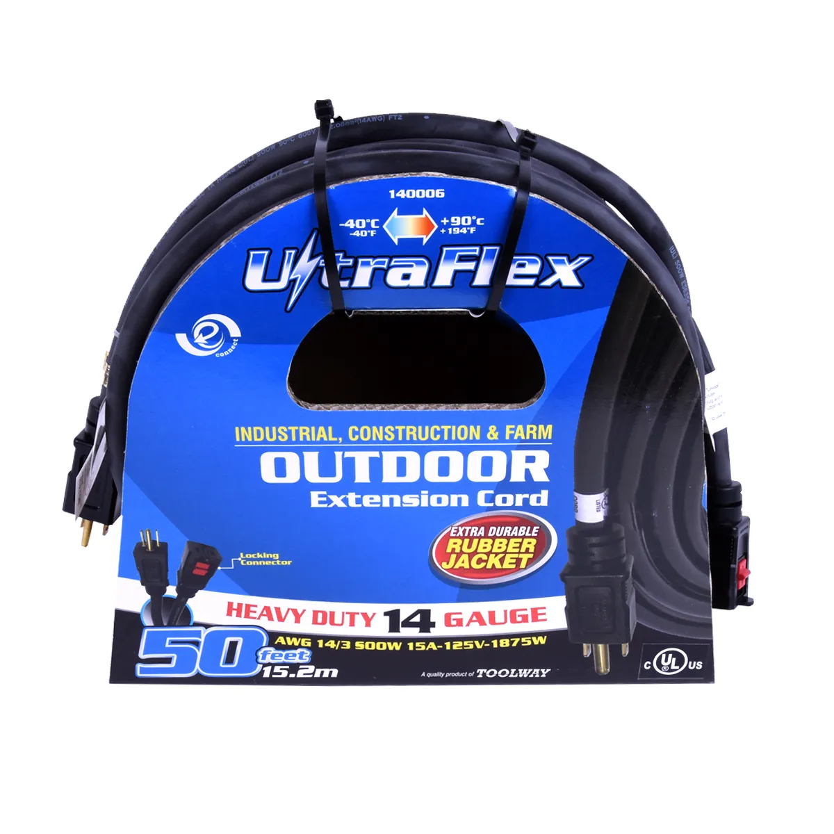 The FlexiCord Indoor/Outdoor 14/3 Extension Cord is built for tough jobs and extreme conditions, delivering reliable power when you need it most. Featuring a rugged black SEOOW rubber jacket, it resists moisture, cracking, and heat for dependable performance year-round. Self-locking connectors ensure a secure connection, reducing accidental unplugging during use. With a wide temperature range of -50°C to +105°C (-58°F to +221°F), this cord is ideal for construction sites, workshops, and outdoor applications.