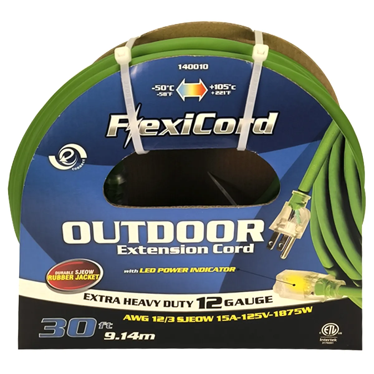 The FlexiCord Indoor/Outdoor 12 Gauge Extension Cord is built for tough jobs and extreme conditions, delivering reliable power when you need it most. Featuring a high-visibility green SJEOW rubber jacket, it resists elements like moisture and oil while remaining flexible in harsh environments. Lighted connector ends clearly indicate when power is active, allowing quick and easy monitoring from a distance. With a wide temperature range of -50°C to +105°C (-58°F to +221°F), this cord is ideal for job sites, workshops, and outdoor equipment use.