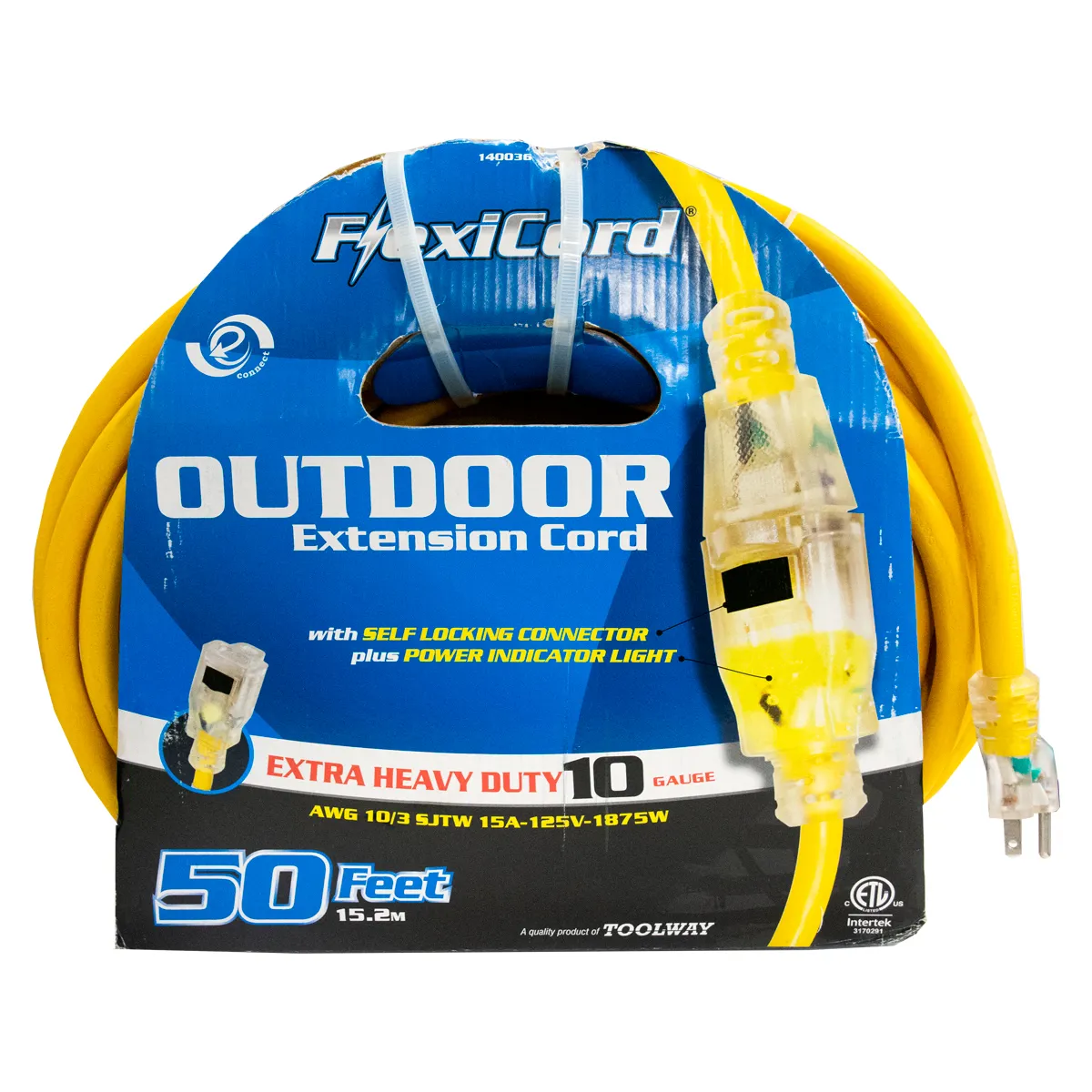 The FlexiCord Outdoor 10/3 Heavy Duty Extension Cord delivers professional-grade power with a high-visibility design built for tough job sites. Its extra-durable yellow PVC jacket resists water and flame while staying extremely flexible from -40°C (-40°F) to +60°C (+140°F). The self-locking connector prevents accidental pull-apart, and LED power indicator ends confirm live power at both ends. Built with premium materials for lasting reliability.