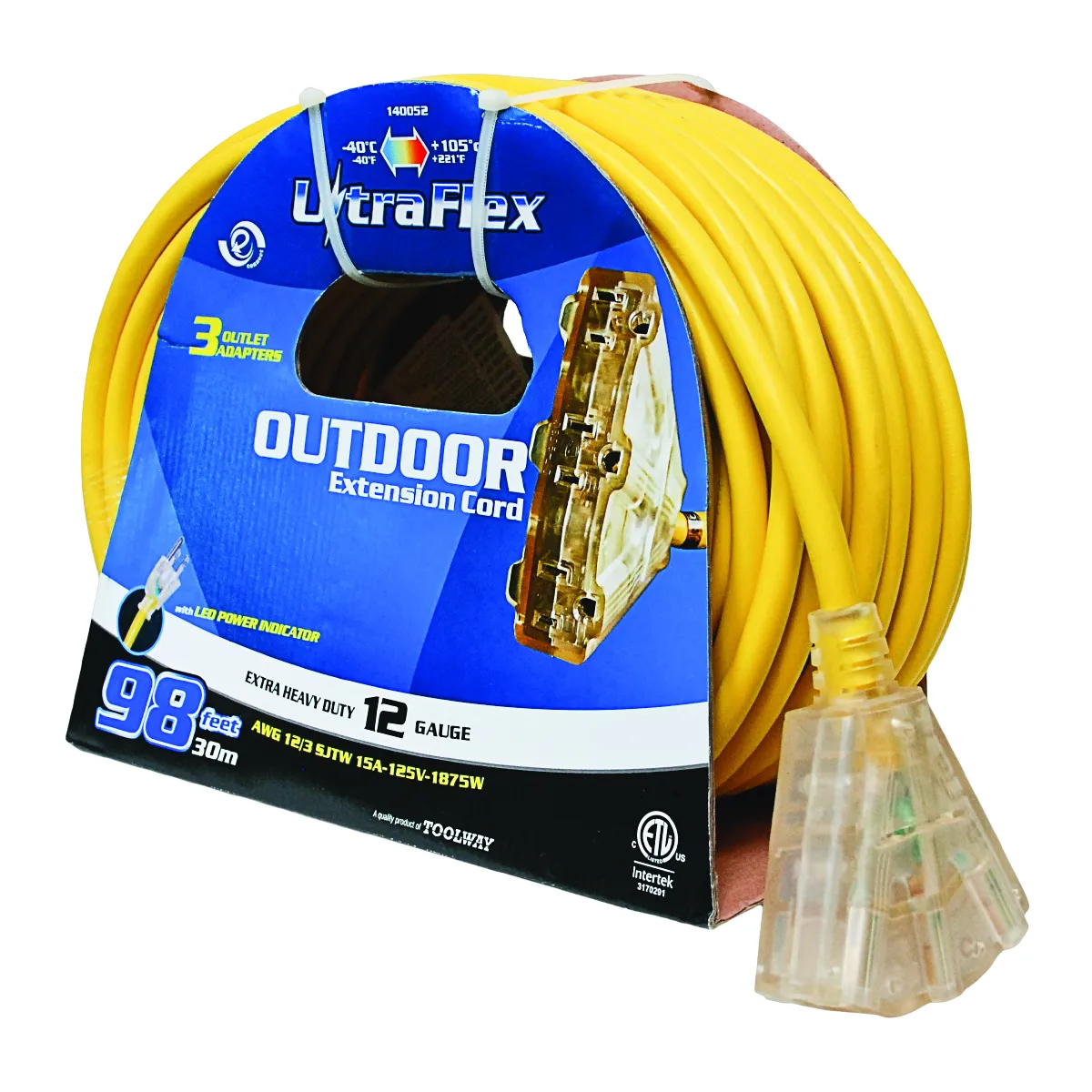 - Heavy duty outdoor extension cord with a 12 AWG SJTW construction.
