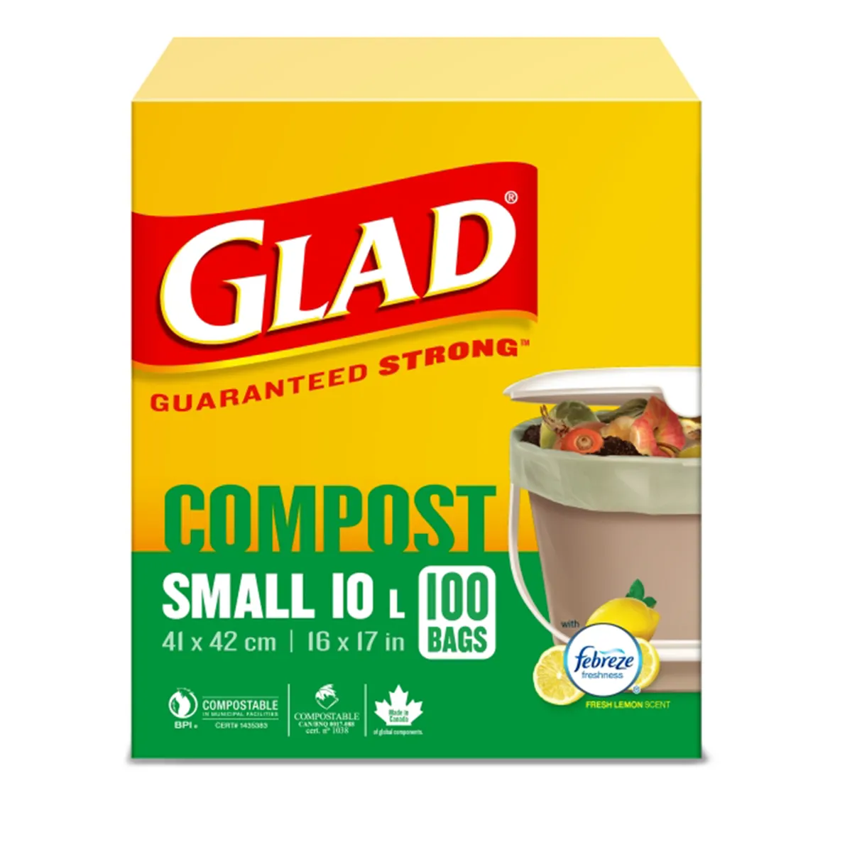 Glad® 100% compostable fresh lemon scent bags keep your compost bin clean and your kitchen smelling fresh.