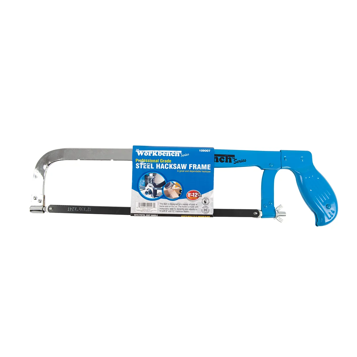 Chrome plated all-steel constructed professional grade hacksaw. Pistol grip designed handle made of heavy duty steel and contoured to provide a comfortable grip and to lessen hand fatigue. Adjustable notched frame design allows the use of 8in ; 10in or 12in hacksaw blades.