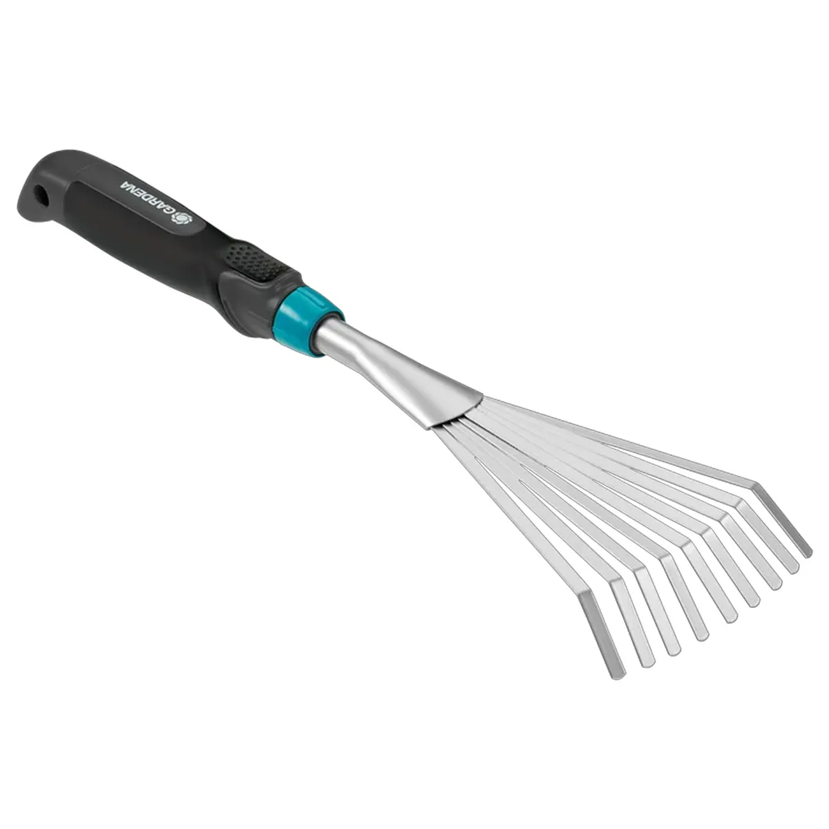 Ergonomic handle type. << The GARDENA Comfort Hand Rake is the perfect tool for raking up leaves; weeds and grass cuttings in small flowerbeds and hard-to-reach areas. The ergonomically formed handle; with its integrated soft component; fits perfectly in the hand and is angled at the end to prevent slipping. The Hand Rake has a width of 12 cm. It is produced from high-quality steel. The Duroplast coating ensures a long product lifetime.
