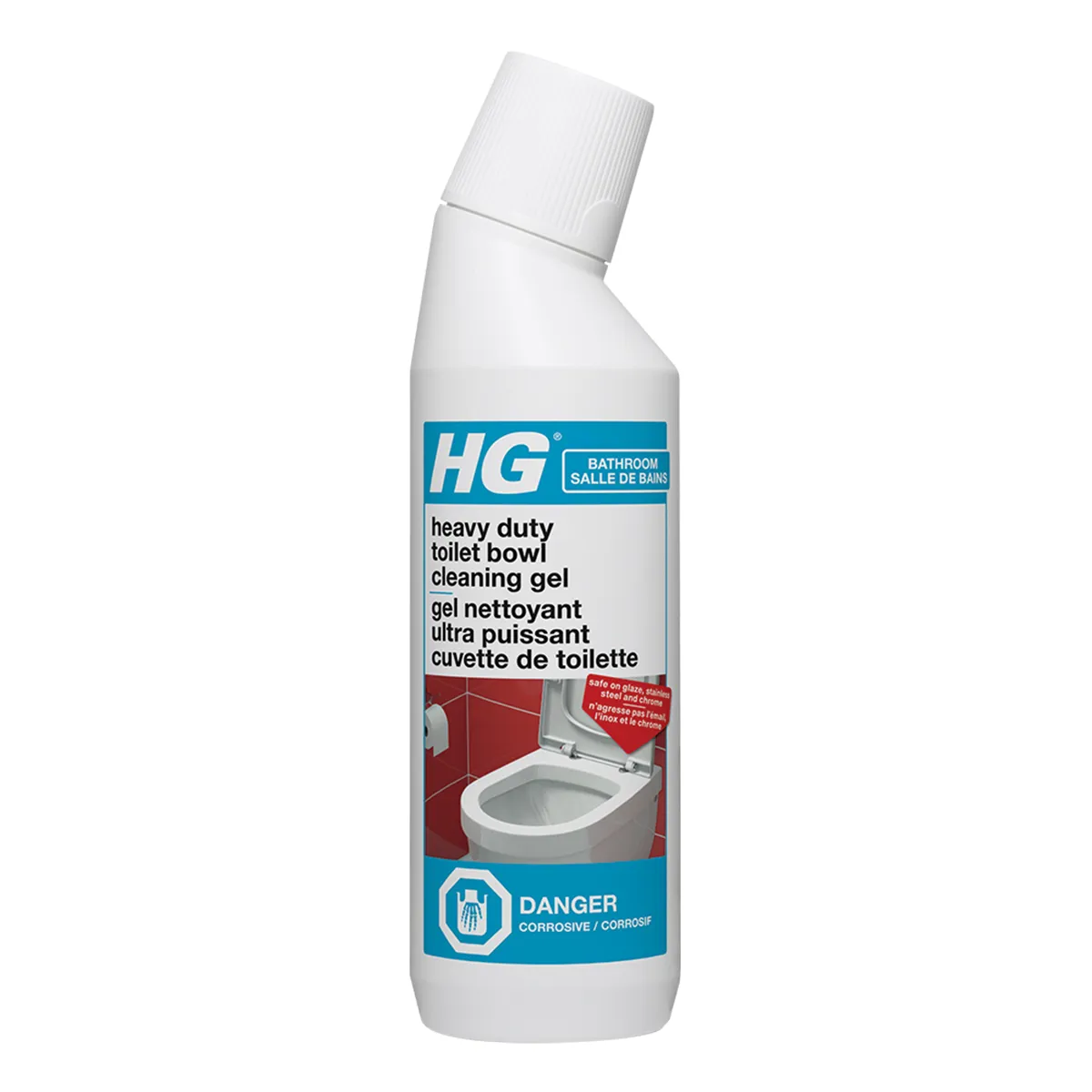- it can cause a musty odour and it reduces the flush action of the toilet. The specially developed formula of HG heavy duty toilet bowl cleaning gel works on the surface of the toilet bowl and ensures an effective removal of all problem buildup. This product does not contain hydrochloric acid which can damage the glaze in the bowl and can damage stainless steel and chrome. In other words; HG heavy duty toilet bowl cleaning gel is safe for glaze; stainless steel and chrome.