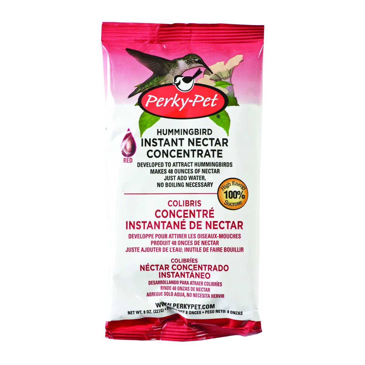 With such a high-energy lifestyle, hummingbirds need to eat constantly. Perky-Pet Ready-to-Use Red Hummingbird Nectar is made of 100% sucrose, so your hummingbirds get just the essential energy they need to thrive. Hummingbirds easily digest sucrose, so the energy is delivered faster than artificial nectar mixtures! They won’t be able to resist stopping for a drink! This concentrate makes feeding hummingbirds simple, just add water to create your desired amount of nectar. The bag makes up to 48 ounces of hummingbird nectar to keep you in good supply through many visits. There’s no need to boil it and our nectar requires no refrigeration, making storage a breeze! In addition, this nectar features a clear, non-staining formula so there’s no need to worry about drips or spills.