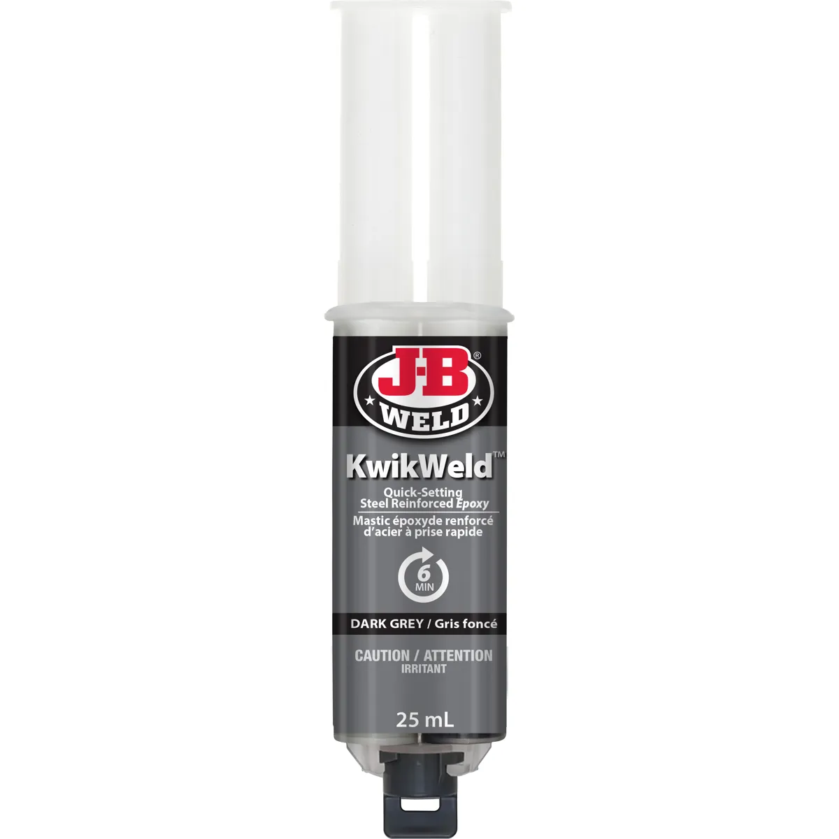 KwikWeld™ is a fast-setting version of The Original J-B Weld two-part epoxy cold weld system that provides strong; lasting repairs to metal and multiple other surface types. After mixing; it forms a permanent bond and can be shaped; tapped; filed; sanded and drilled after curing. KwikWeld™ has a 1:1 mixing ratio; sets in 6 minutes and is fully cured in 4-6 hours. KwikWeld™ cures to a dark grey color; is rated at a tensile strength of 3127 PSI and will withstand temperatures up to 300ºF.