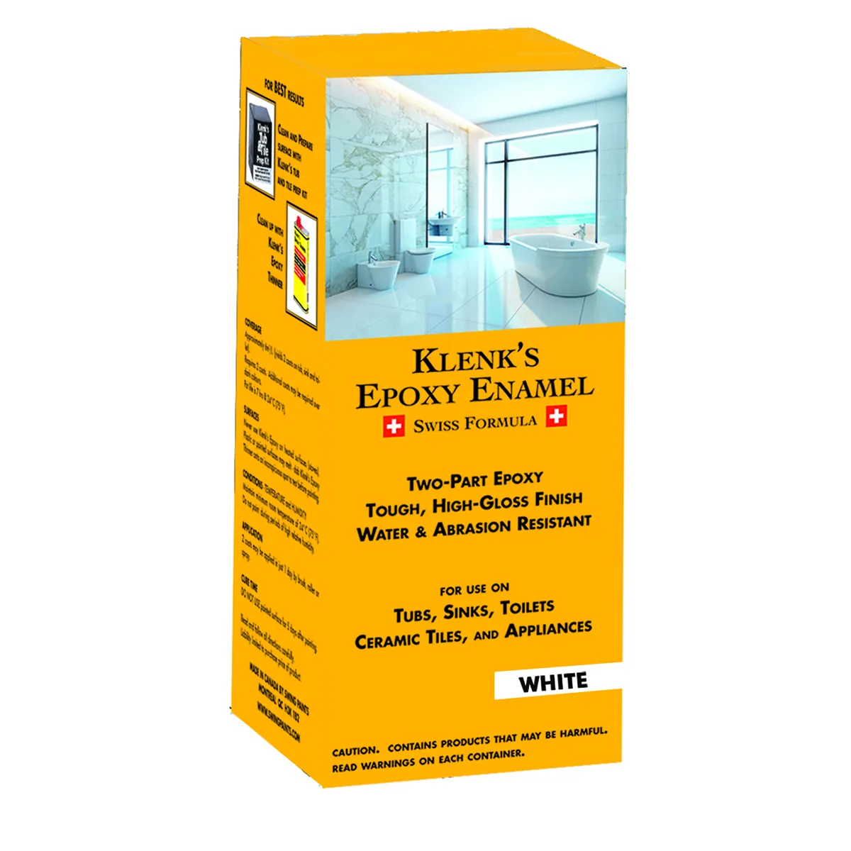 Klenk's Epoxy enamel is an extremely hard and durable two-component epoxy for consumer and professional use. It is specially designed to restore the finish on tubs; sinks; toilets; ceramic wall tiles; and appliances. Klenk's Epoxy enamel can be used on any hard; solvent-resistant surface; such as ceramic; metal; stone; marble; melamine; fiberglass; etc. Do not use on plastic or imitation marble; stove top ranges; or other surfaces subject to excessive heat. Always test surface with Klenk's epoxy thinner prior to use.