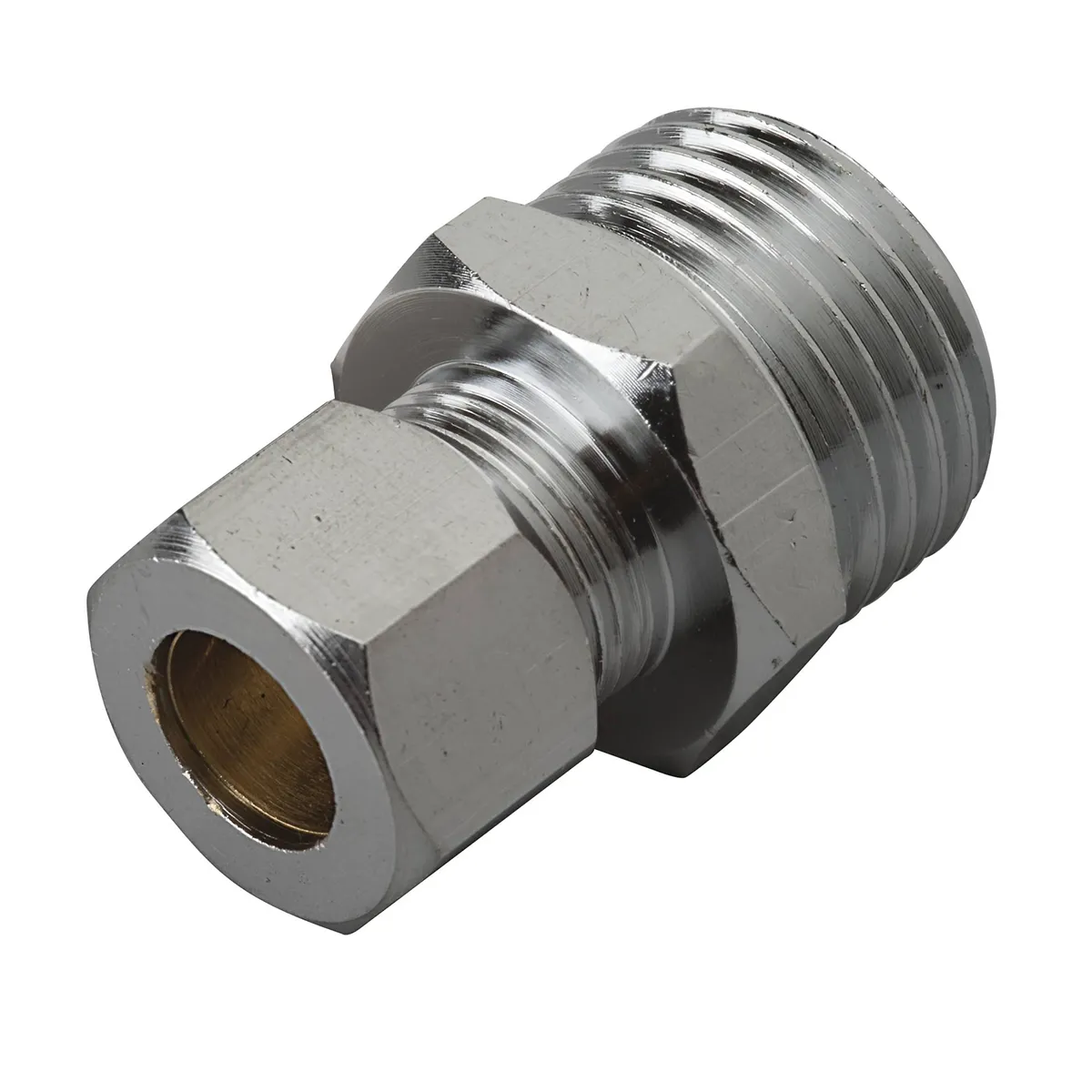 M4414 Straight Connector. 3/8 inch compression x 1/2 inch MIP Connection. It is made of Chrome plated brass.