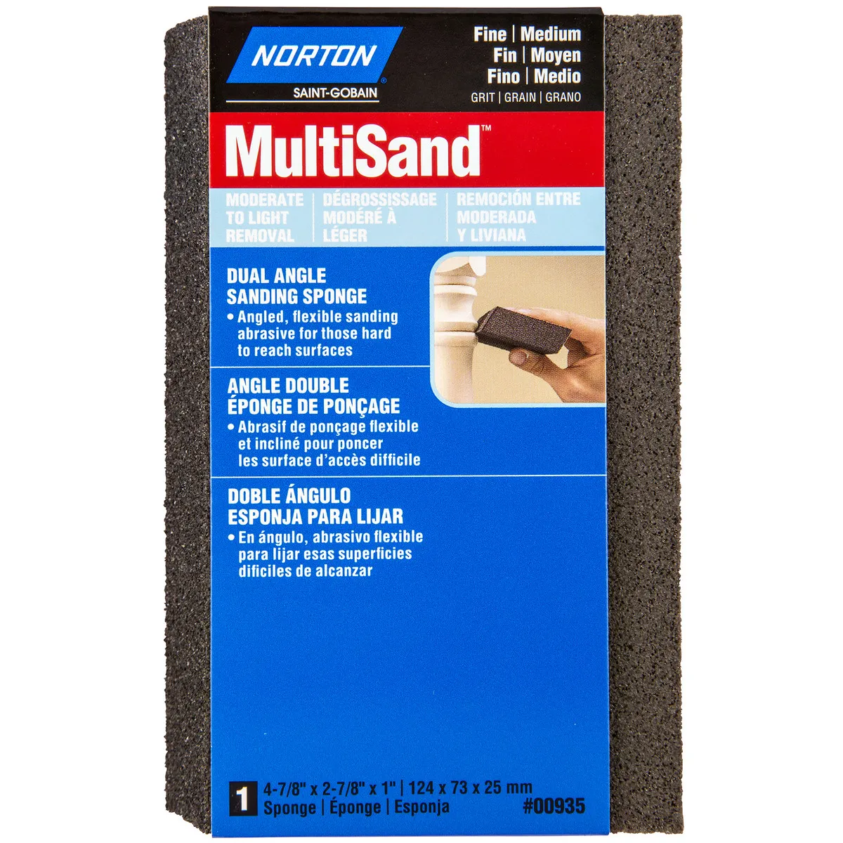 Firm sponge with angled sides for sanding inside corners and crevices of hard-to-reach areas on a variety of materials.