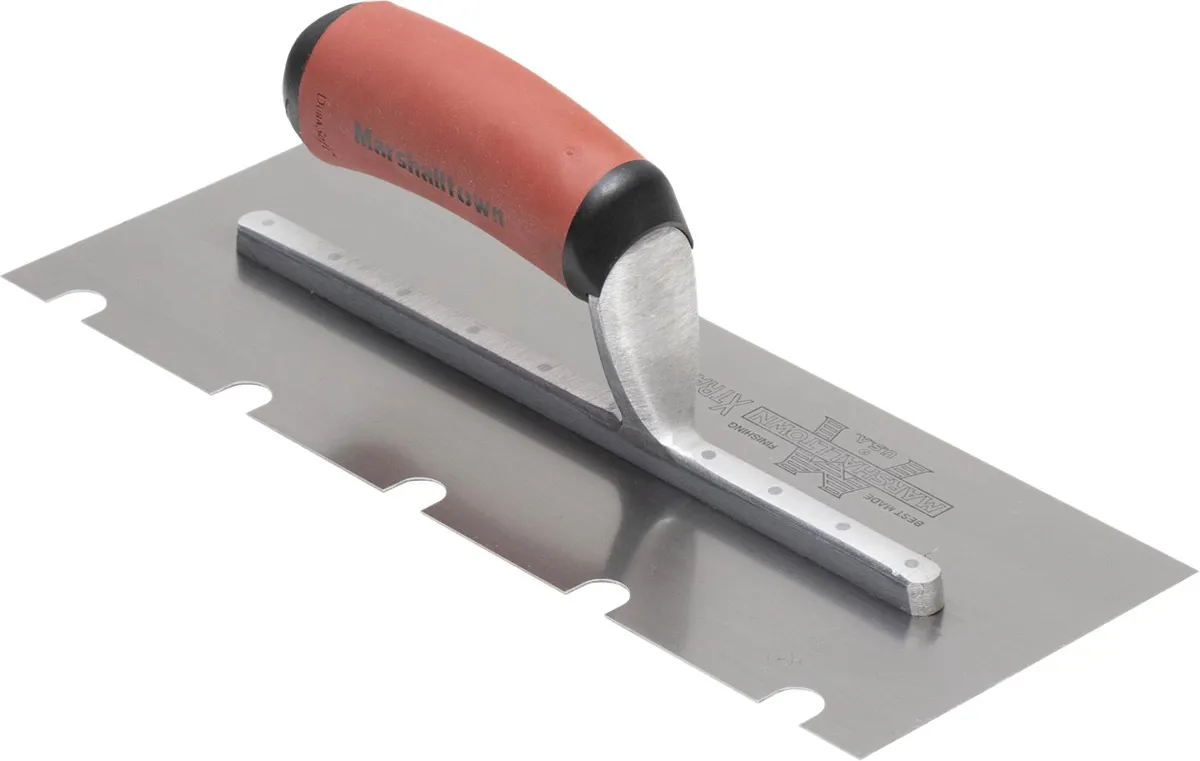 MARSHALLTOWN EIFS Trowels are essential for EIFS applications. The square or U-shaped notches easily spread large quantities of mortar or adhesive and leaves behind even grooves for smooth EIFS paneling. The lightweight aluminum alloy mounting is riveted to a Carbon Steel blade. Along with blade material and notch shape; you can also choose your preferred notch size and handle material. Choose between a resilient DuraSoft® handle for increased comfort or a curved hardwood handle that molds to your hand. All variants of this notched trowel are Made in the USA with Global Materials.