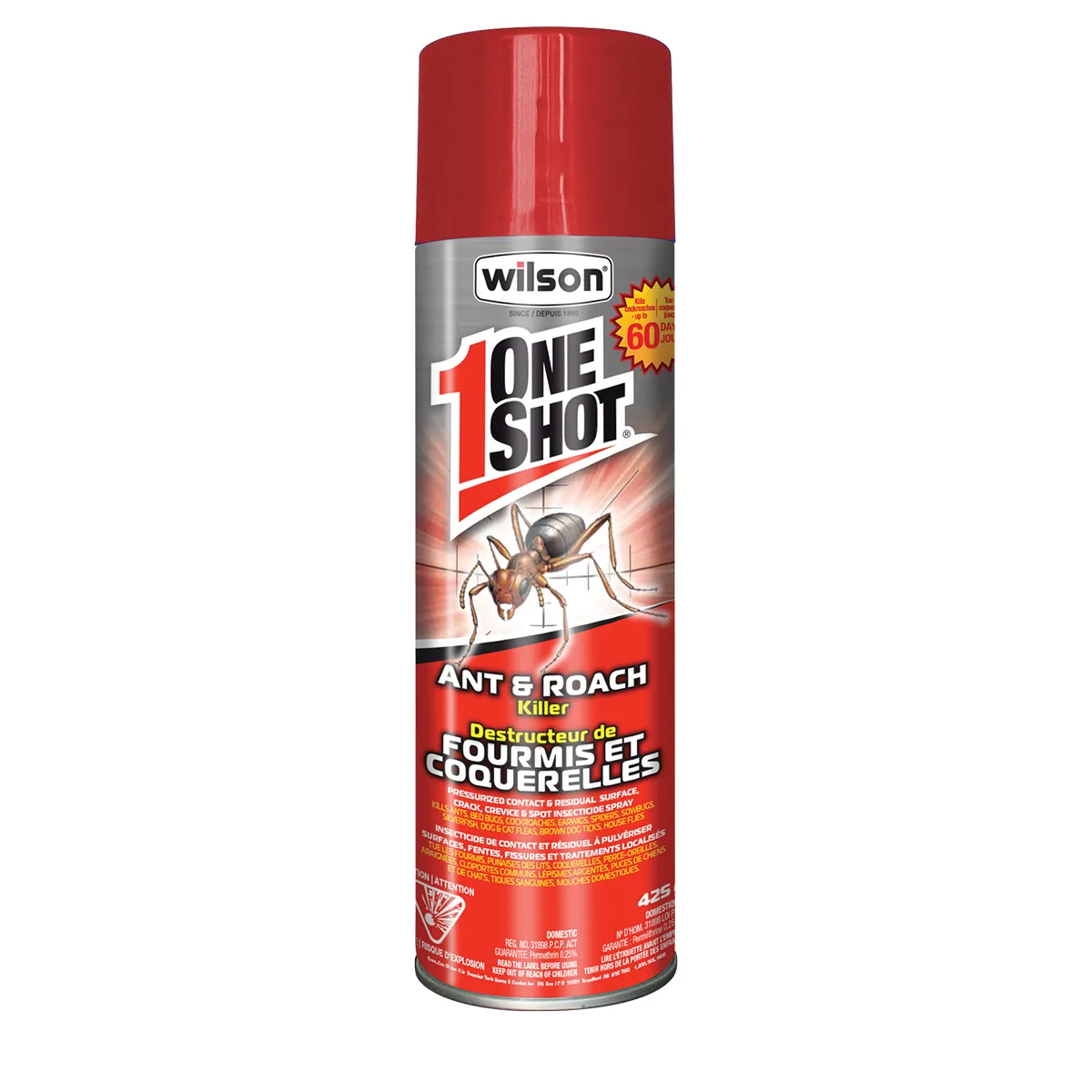 Suitable for use indoors/outdoors WILSON® ONE SHOT® ant & roach killer is a contact and residual insecticide designed to effectively kill ants; cockroaches and many other insects; such as bed bugs; dog and cat fleas; house flies; crickets and spiders. This product is fast-acting and will kill for up to 60 days. It can be used indoors or outdoors; in several different places such as in cracks and crevices; along and behind baseboards and around light fixtures; foundations and sinks.