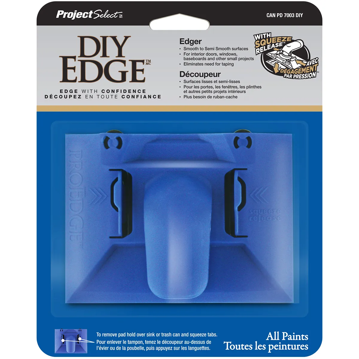 - Just hold over sink or trash can and squeeze tabs to release the pad.