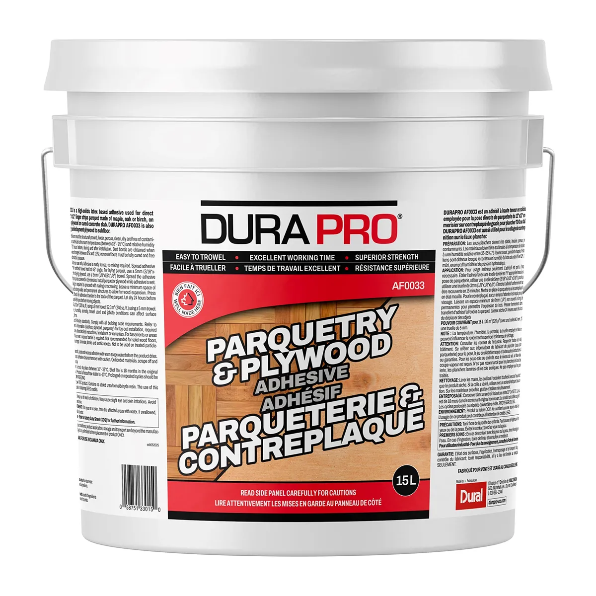 Durapro af0033 is a high-solids latex based adhesive used for direct glue-down of 12in x 12in finger strips parquet made of maple; oak or birch; on t&g floor grade plywood or cured concrete slab.