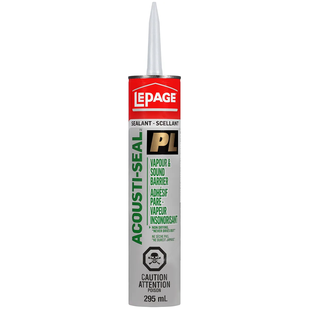 LePage PL acoustic seal vapor barrier and sound reduction adhesive is made with a unique blend of synthetic rubber and polymers to bond polyethylene vapor barrier films to metal; concrete; masonry; asbestos; gypsum; board; plaster and wood. This provides an efficient seal to reduce airborne sound transmission in wall assembly systems. Our versatile adhesive can also be used as bedding compound over vibrating elements; electrical boxes or other items recessed in (or passing through) walls. LePage PL Acoustic-Seal is incredibly durable; too; remaining flexible at extremely low temperatures and resisting water even when immersed. Since this adhesive does not dry; it's normal for it to accumulate dirt; but this won't affect its functionality. For best results; use LePage PL Acoustic-Seal in concealed areas only.