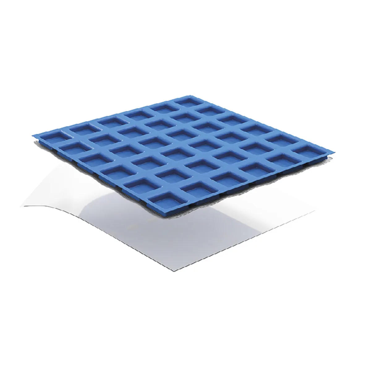 - It is a high density polyethylene membrane provided with a grid structure of square cavities, each cut back in a dovetail configuration. On the back side it is provided with a non-woven thermo-welded polypropylene fabric that guarantees the adhesion with an adhesive.