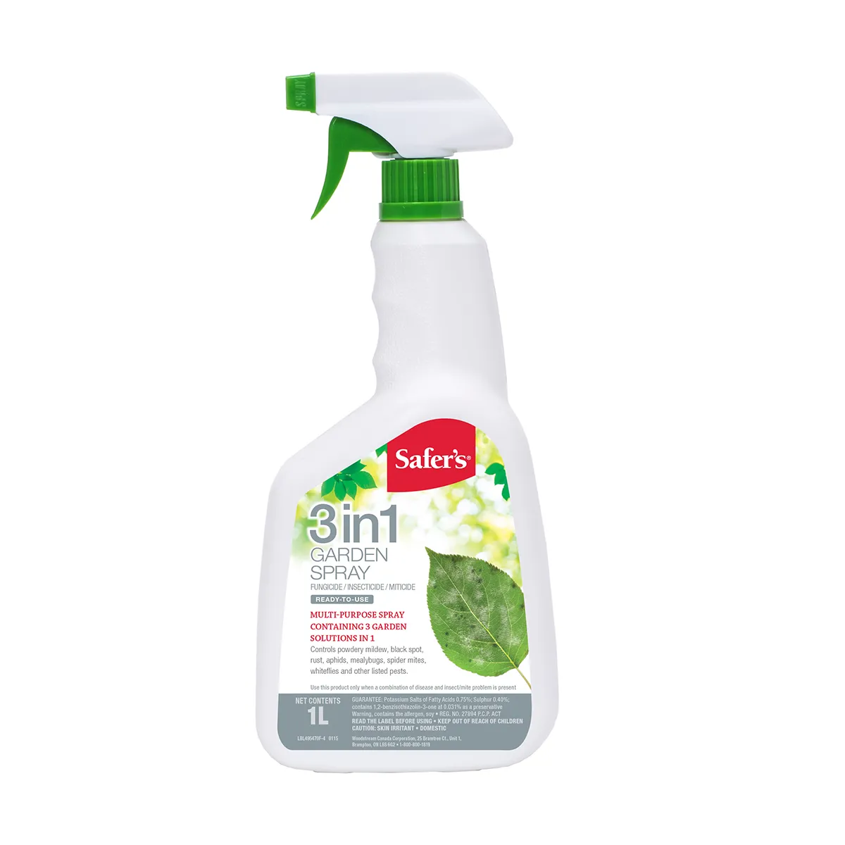 Safer’s 3-in-1 Garden Spray combines the power of a fungicide, an insecticide and a miticide to knock out your garden problems. Now, you can control fungal diseases, insects, and mites with one simple solution. There’s no need to be a gardening expert to have a healthy garden – our 3-in-1 Garden Spray tackles it all. This unique formulation is gentle on most plants and can be used right up until the day before harvest. Potassium salts of fatty acids, derived from natural fats and plant oils, kill destructive insects such as aphids, mealybugs, spider mites, whiteflies, and more on contact. It works by weakening the protective outer shell of soft-bodied insects, ultimately causing them to dehydrate and die. Diseases, including powdery mildew, black spot, rust, and leaf spot, can quickly spread and cause irreversible damage. Sulfur attacks these fungal diseases by creating an unwelcoming environment for disease growth, ultimately stopping the spread of the fungus. When damaging insects or fungi attack your garden plants, having a solution that’s simple is the way to go. Safer’s Insecticidal Soap comes in a convenient ready-to-use solution to make eliminating insects easy. Simply spray your plants at the first sign of insect damage and apply every 7-10 days when listed insects, mites, or diseases are present. It’s important to thoroughly cover all plant surfaces (including the bottom of the leaves) and to continue to spray the solution to the point that it begins to drip off the plant.