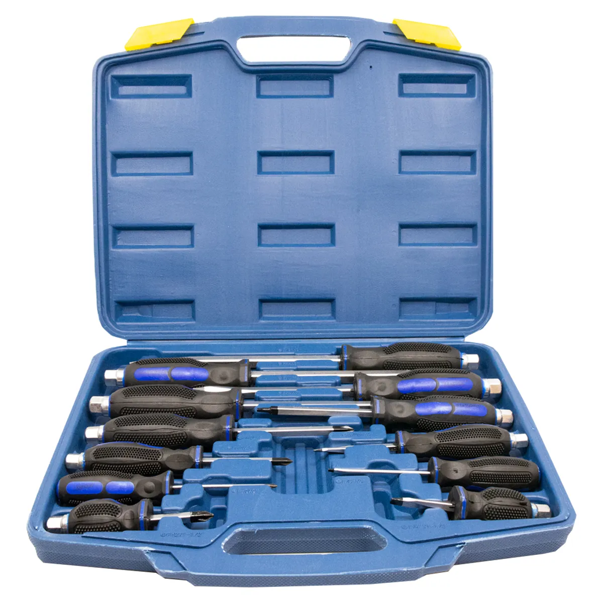 The Matrix 12 piece screwdriver set by Toolway is perfect to tackle jobs around the home; garage or job site. This set is designed with ergonomic comfort grip handles so your hands don't get tired and is constructed with solid go through shanks and hex Nut heads that helps supply additional torque. All pieces are contained in a plastic molded Carrying case.