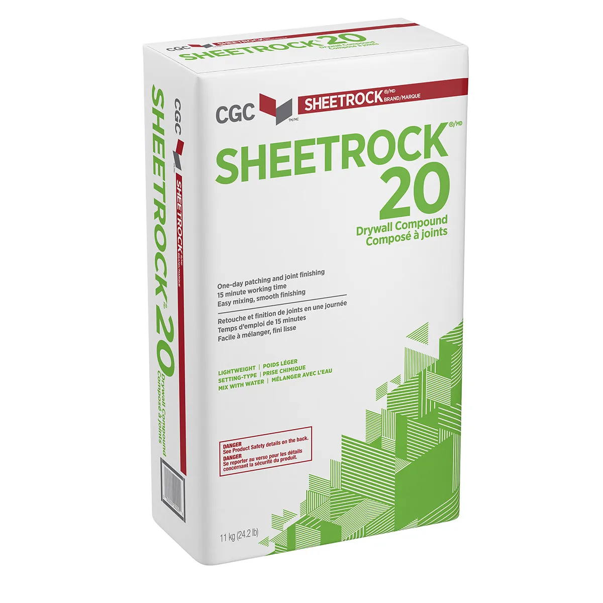 CGC Sheetrock® Brand 20 Setting-Type Drywall Compound is an excellent compound for embedding tape; bead; and trims. It's special formulation provides a lightweight product with a superior bond; permits same-day joint finishing and is easy to handle and sand. It is ideal for heavy fills and is unaffected by humidity. CGC Sheetrock® Brand 20 Setting-Type Drywall Compound can also be used in laminating gypsum panels to above-grade concrete surfaces.