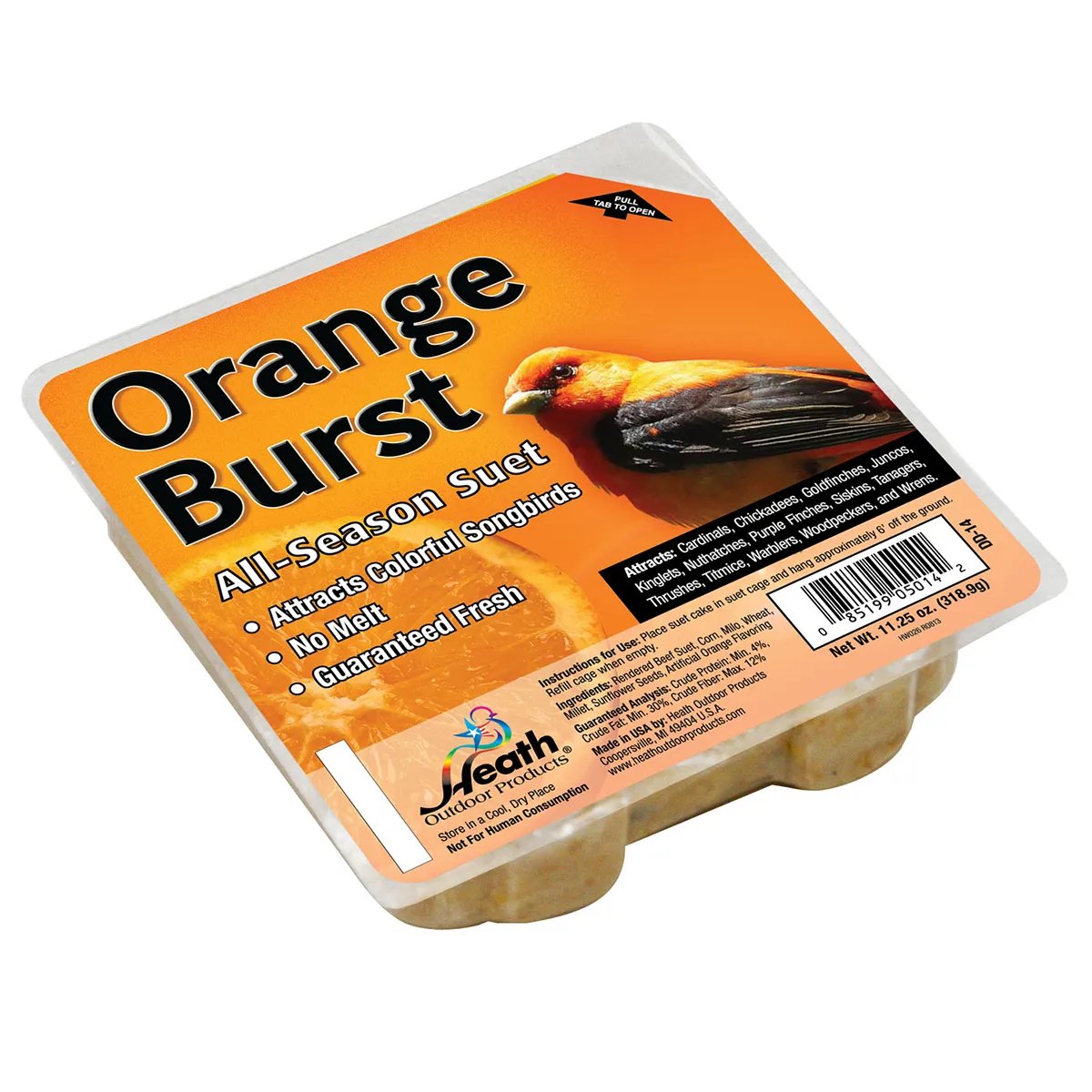 Wild bird food suet cakes orange burst blended suet; seed and orange flavoring. For use with a variety of birds.