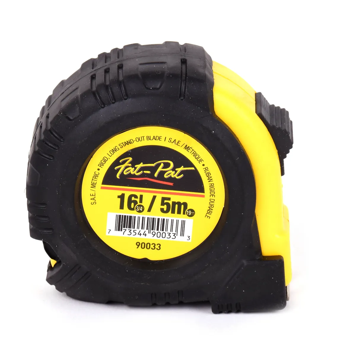 The Tooltech FatPat Tape Measure has a durable impact-resistant ABS case for longer life. Rigid; long stand-out blade with rubber bumper on blade return to extend blade life. Fractional EZ-Mark facilitates reading with its high-contrast black and red graduations.