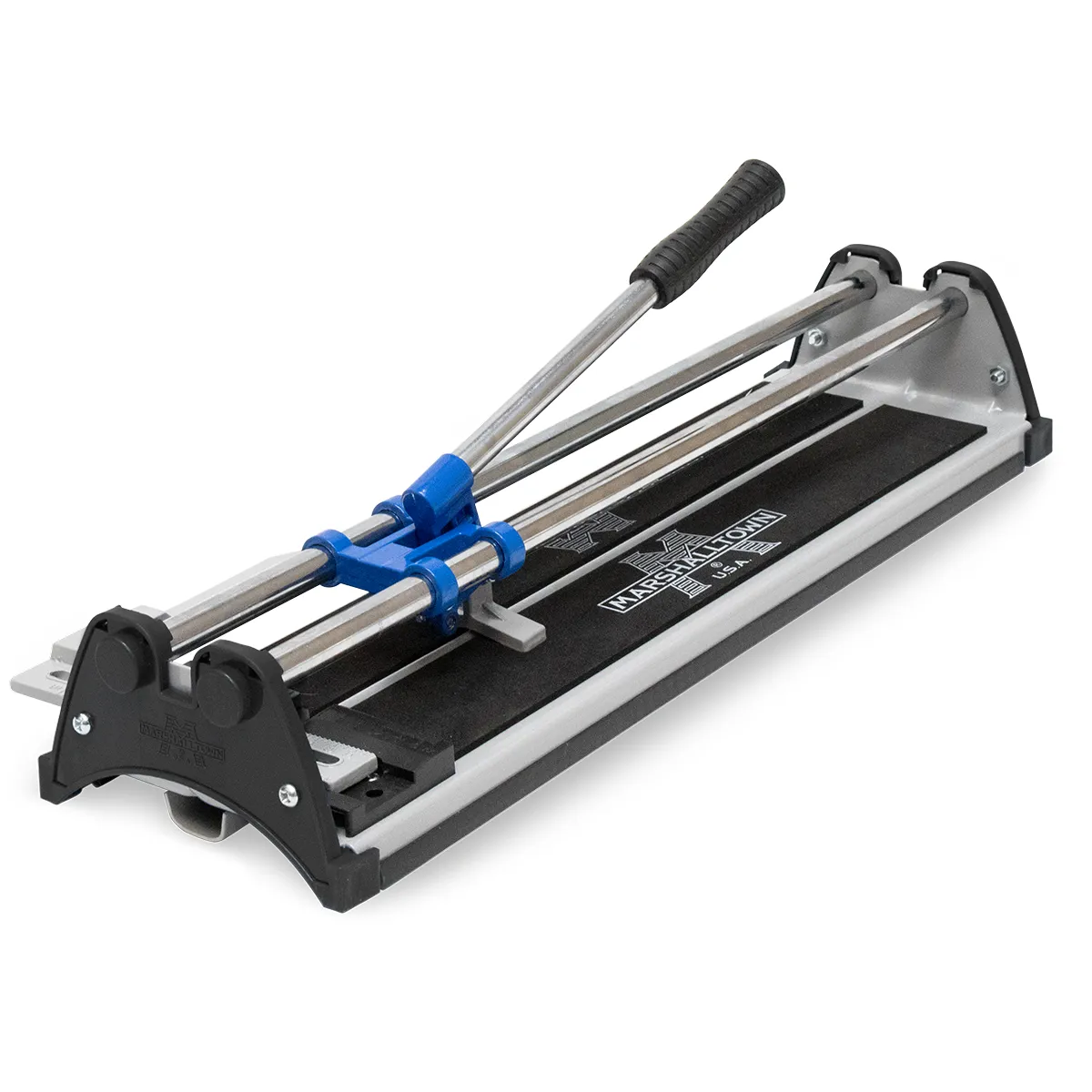 This versatile MARSHALLTOWN Tile Cutter can cut ceramic; glass; and mosaic tile up to 17in long and ½in (12 mm) thick. You can also cut tile up to 12inx12in (305 x 305 mm) at a 45-degree angle for different tile installations. This tiling tool has a two-rod rail system that allows smooth operation as the tungsten carbide scoring wheel scores the tile for quick; easy cuts. It also includes an adjustable measuring guide for precise cuts. Note: Not recommended for porcelain tile.