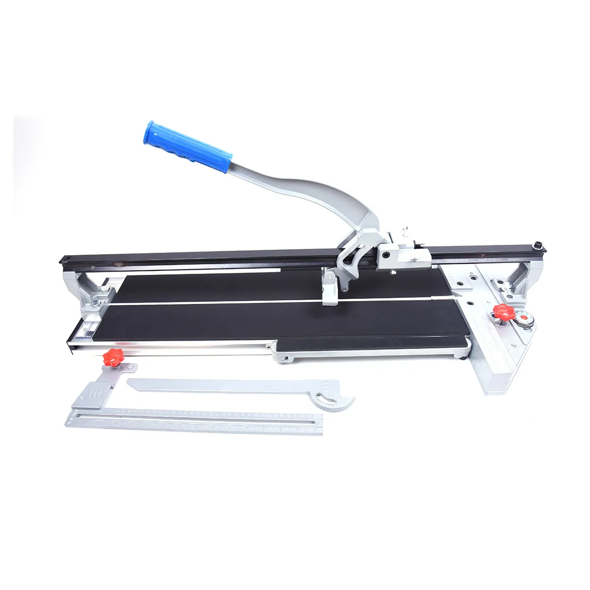 Professional Heavy Duty Tile Cutter that features a Tungsten-Alloy Japanese cutting wheel with a high leverage handle. Equipped with an aluminum die-cast base, reinforced HD breaker bar and a 4-ball bearing revolutionary sliding mechanism. Cutter also has a Rubber padded bed and 3 in 1 heavy duty square.