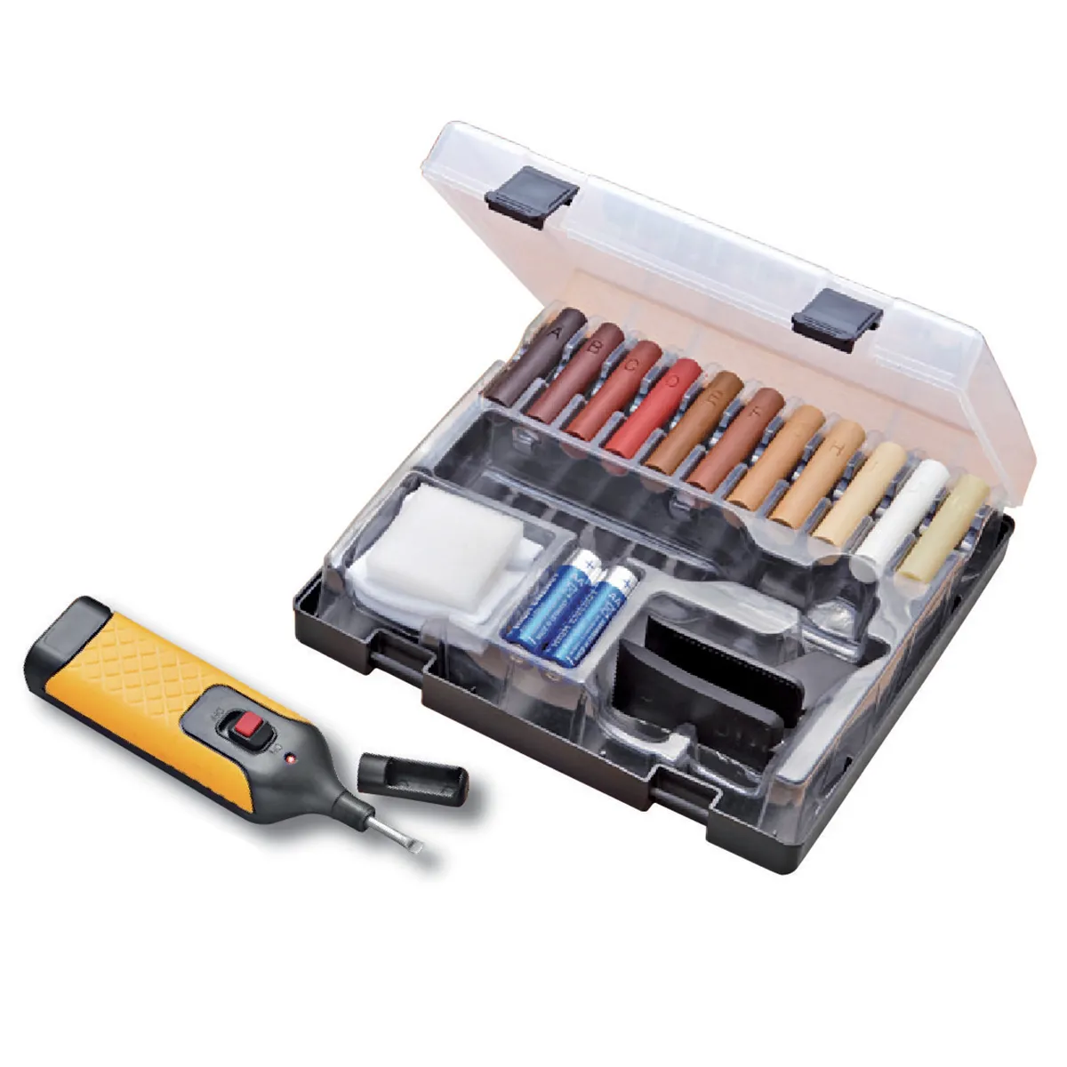 Quickly and efficiently hide imperfections, nail holes, nicks and scratches from a multitude of wood surfaces with Toolway Tradition’s Wood and Laminate Repair kit. Safe to use on furniture, cabinets and hardwood floors, this product is also perfect for laminate flooring. Includes 11 assorted wax colour sticks to make matching most wood finishes quick and easy and a battery-operated precision tipped wax melting device for exact applications. Saves you time and money by allowing you to repair instead of having to sand, stain and re-finish items.