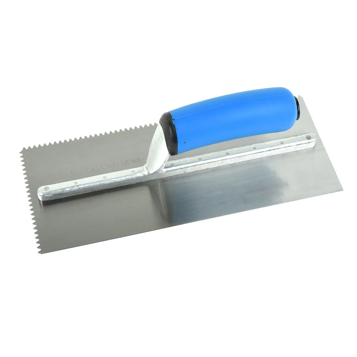 - Trowel features a rustproof SK5 high carbon steel blade measuring 11in x 4 1/2in; with 3/16in v-notches.