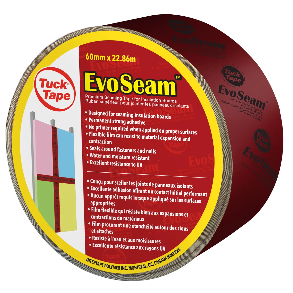 PREMIUM SEAMING TAPE FOR INSULATION BOARDS Sealing joints of insulation boards requires a specially formulated tape that has both a strong adhesive and is flexible enough to withstand the expansion/contraction of the insulation material that happens during extreme temperature changes. Tuck Tape® EvoSeam™ Premium Seaming Tape is the best choice for sealing seams of exterior insulation boards. This tape is made of a multi-layer UV protected polyethylene film coated with a permanent bond adhesive. FEATURES AND BENEFITS.