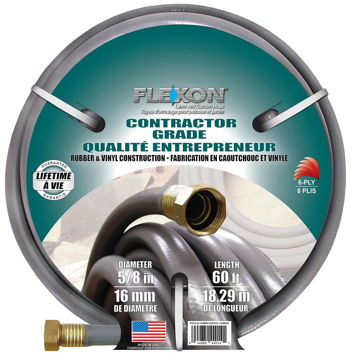 • Made in USA The Flexon contractor Grade garden hoses has superior strength in the toughest applications. The Flexon contractor Grade hoses have a high burst strength; crush proof couplings & are ideal for landscaping; jobsites; & cold weather conditions.
