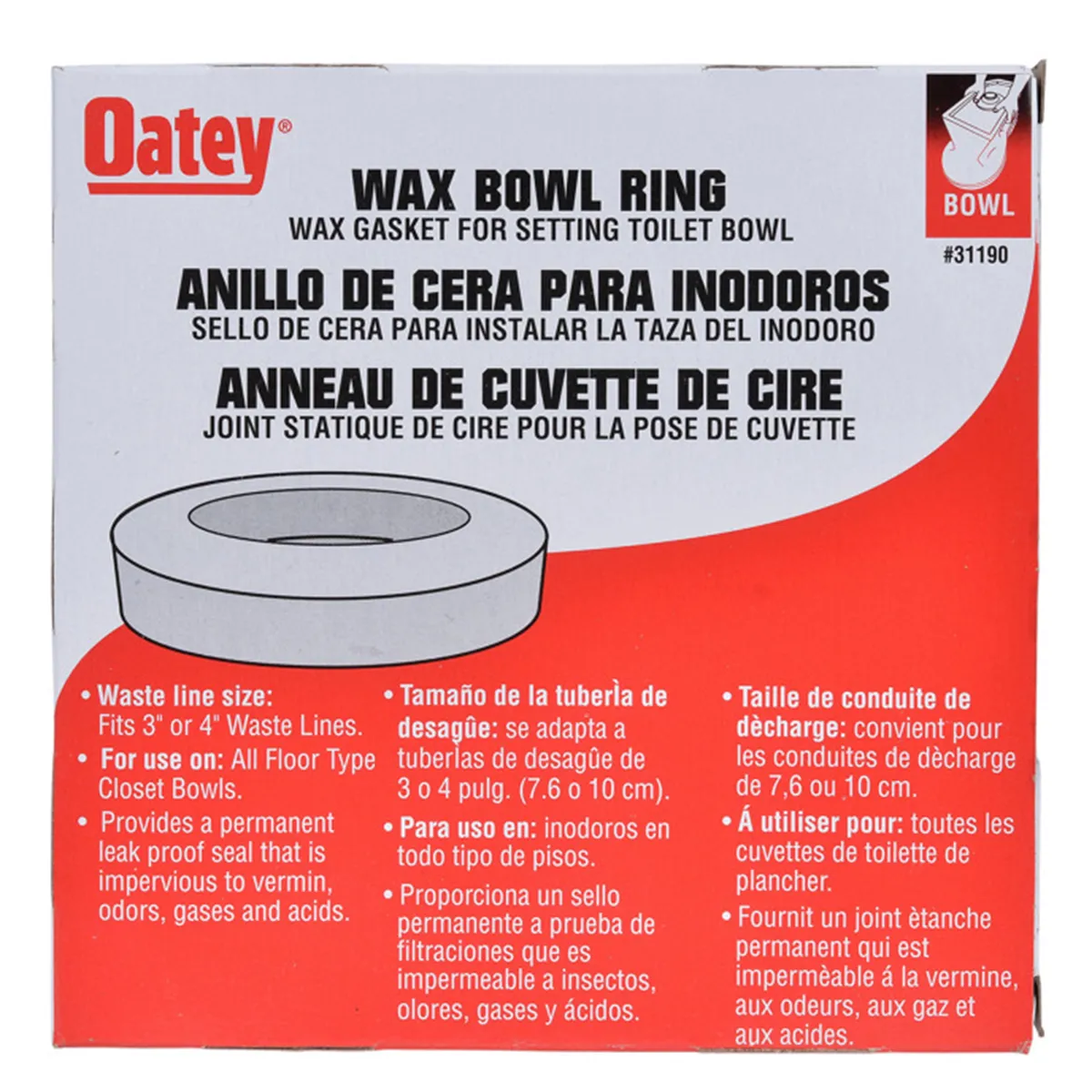 Oatey® Wax Bowl Rings are an essential part of repairing a toilet or installing a new one. Made of 100 percent pure; high-grade petroleum wax that conforms to rough and uneven surfaces; the ring snugly fits over 3in or 4in waste lines; forming a permanent seal to provide permanent; sanitary; gas.
